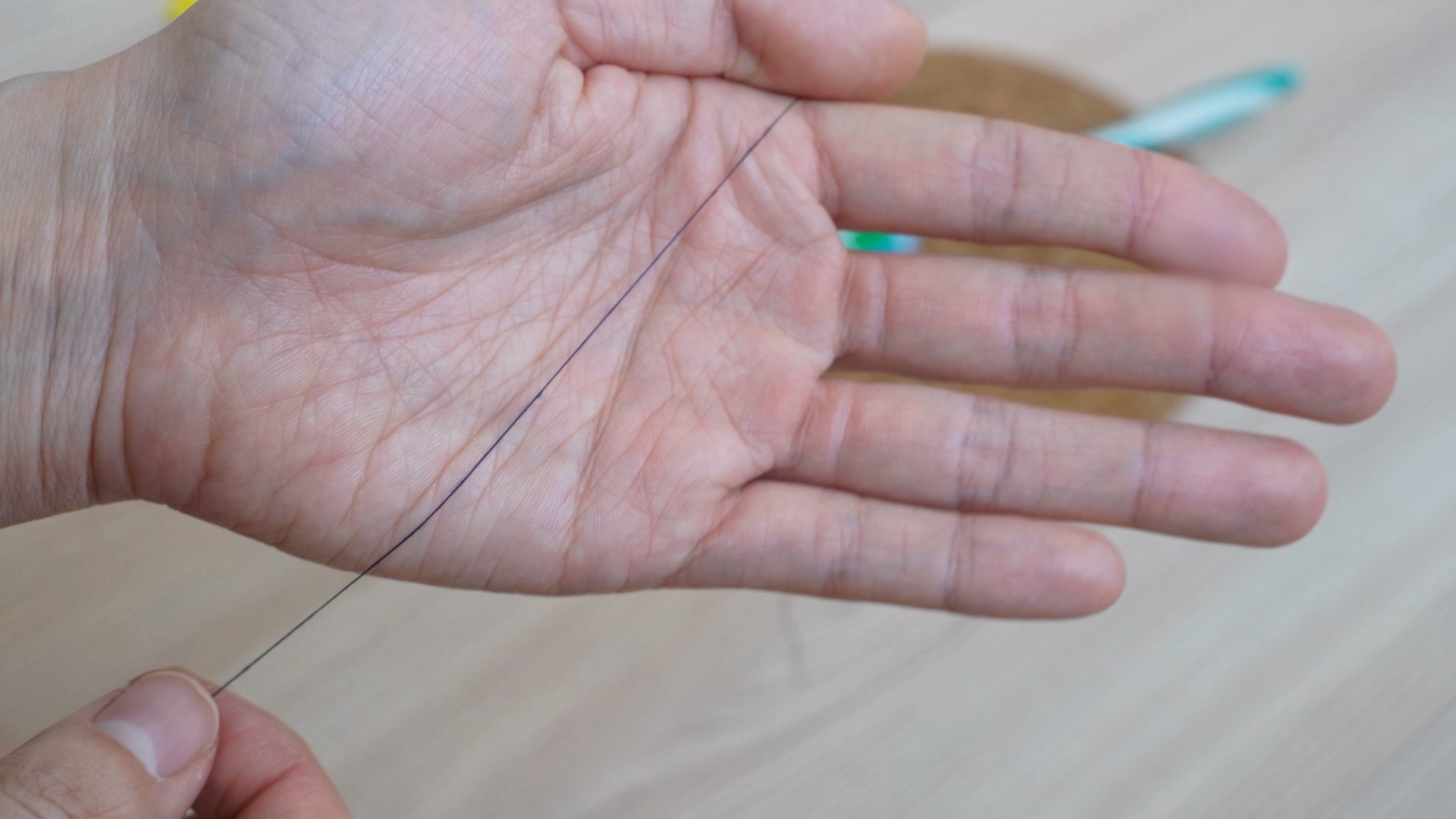 두번째는 바로 손바닥을 이용하는 것이에요. 사진처럼 사용할 실을 손바닥 위에 놓아 주세요.