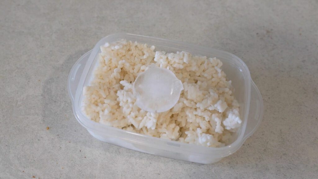 이제 냉동밥을 준비하세요. 그리고 냉동밥에 뚜껑이나 랩 씌우지 않고, 바로 위에 얼음을 올리세요. 일반 물을 넣고 전자렌지 해동을 해도 되지만, 수분이 초반에 모두 날아가 밥이 여전히 딱딱해졌답니다.