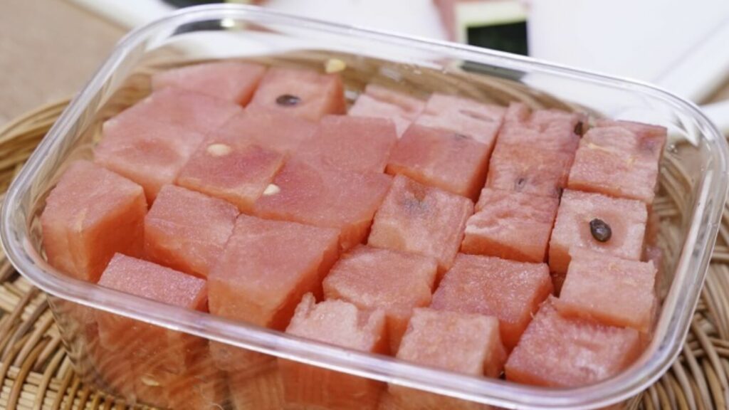 이렇게 썰은 수박은 밀폐용기에 차곡차곡 넣어 보관하면 후식으로 먹기 정말 편해요.