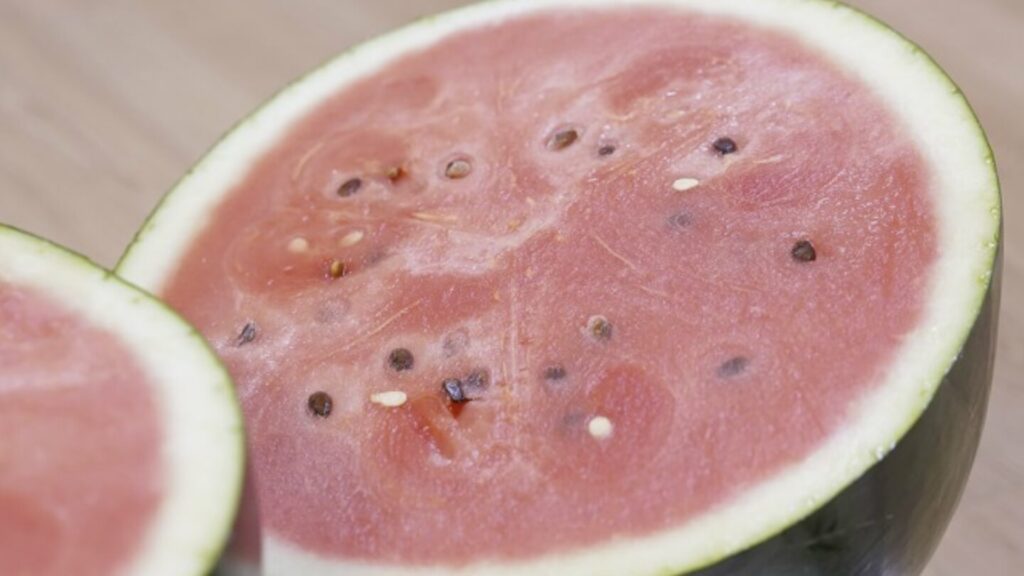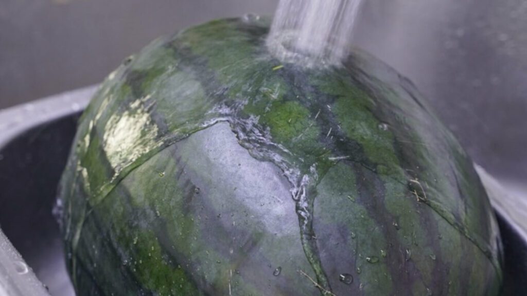 가장 먼저 수박을 자르기 전 해야 할 일은 씻는 것이에요. 물에 한번 깨끗하게 씻어 주세요. 껍질에 세균이 있을 수 있어 그냥 자르면 과육 안으로 세균이 함께 들어갈 수 있어요.