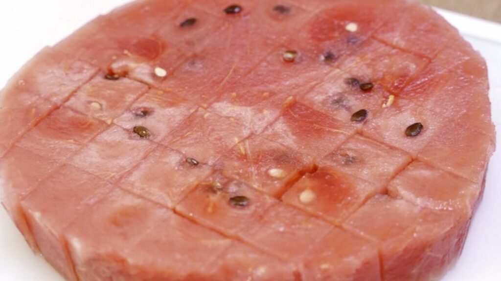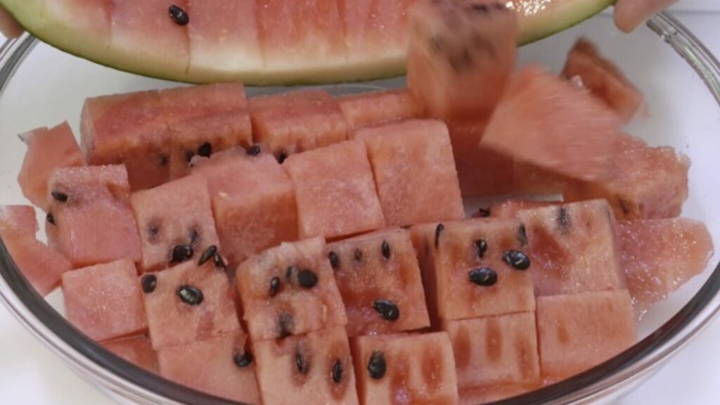 이렇게 자른 후 도마에 수박을 붓게 되면 이렇게 일정한 간격으로 사각썰기가 된 것을 보실 수 있어요.