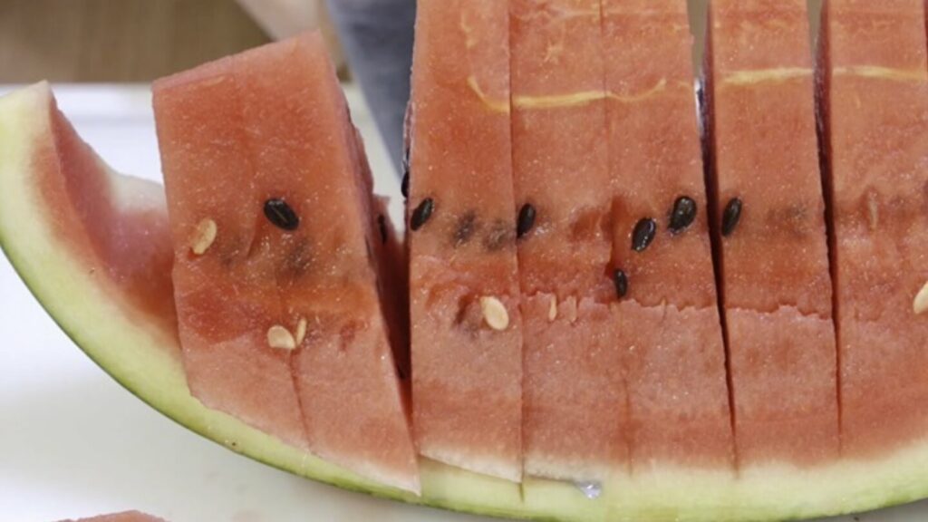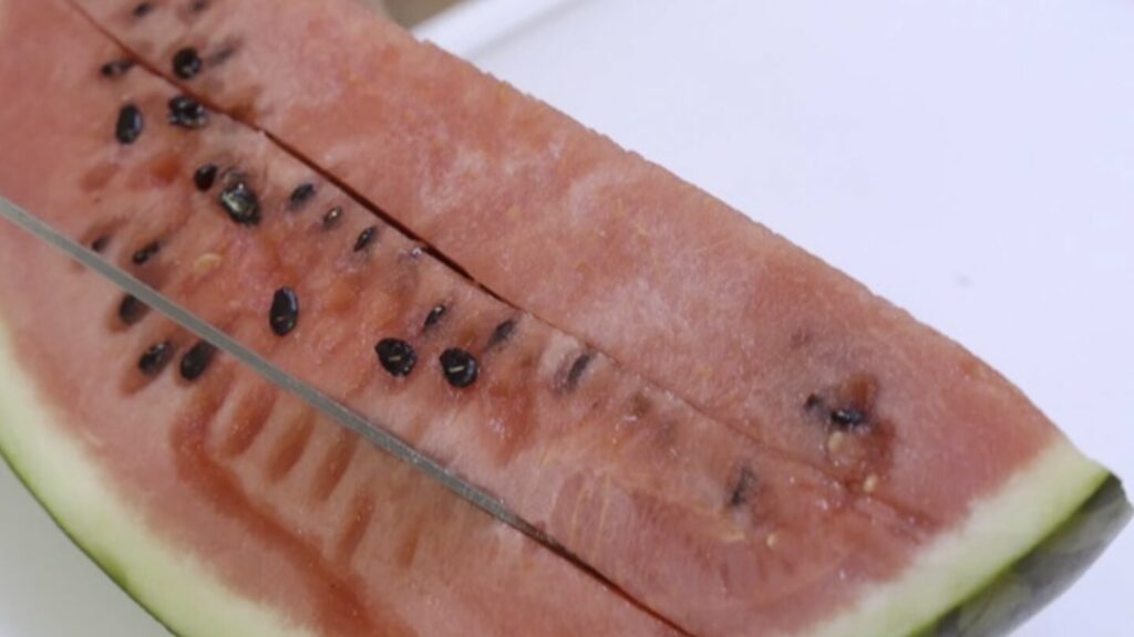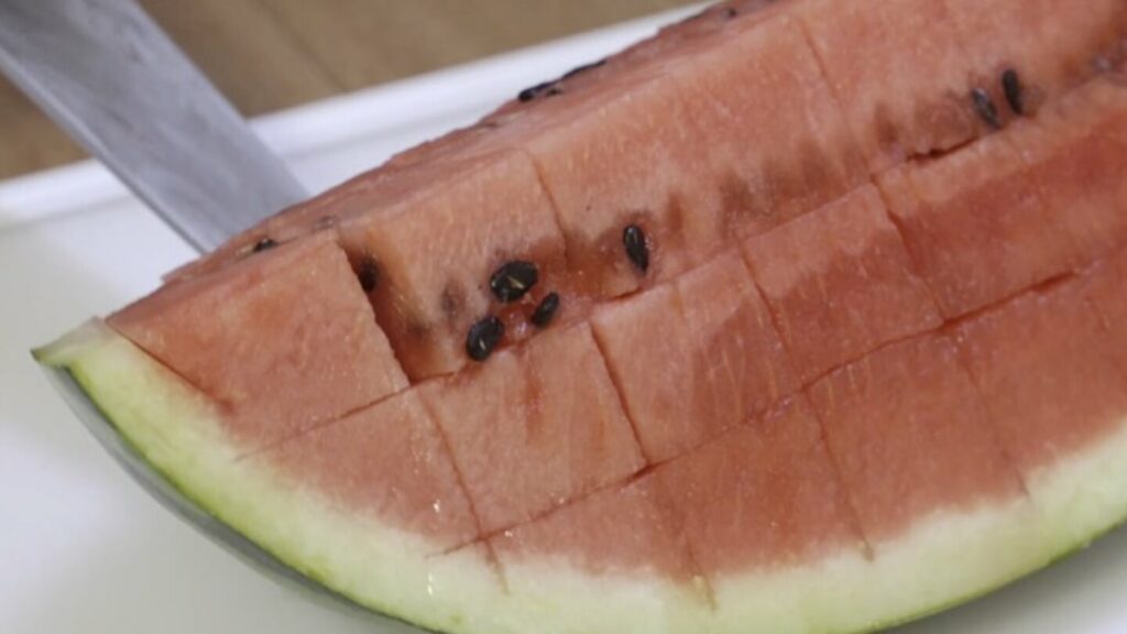 이제 위에서 아래로 한입에 먹기 좋은 간격으로 썰어 놓으세요. 모두 완료 했다면 흰색과 빨간색 과육 경계 부분을 칼로 잘라 주세요.