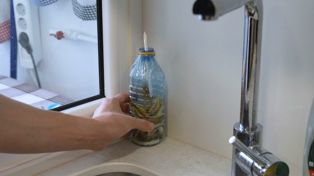 이 트랩을 2~3일 두면 초파리들이 안에 갇히게 되는데요, 병 속 초파리가 죽도록 세게 흔들어 주고 쓰레기를 버려 주세요. 껍질을 주기적으로 교체해 주는 것이 중요합니다.