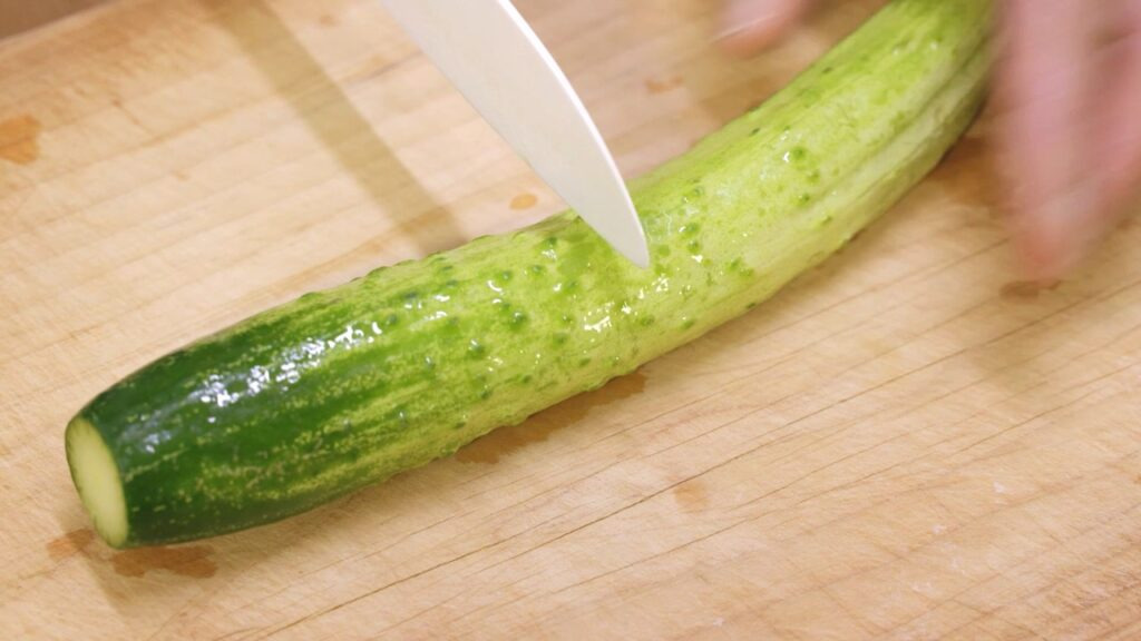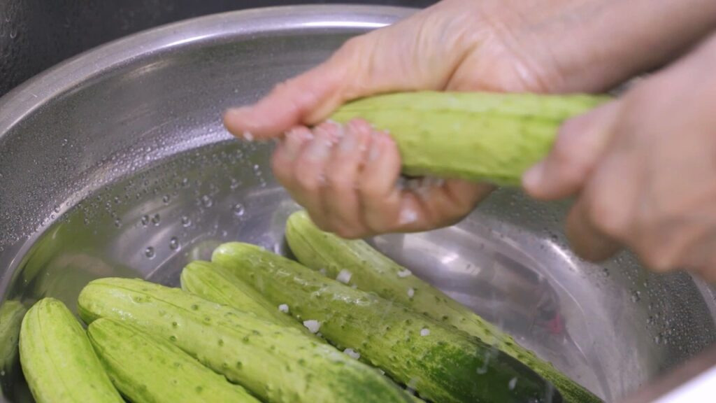 - 오이는 흐르는 물에 씻은 후, 천일염으로 문질러 표면을 닦아주세요.