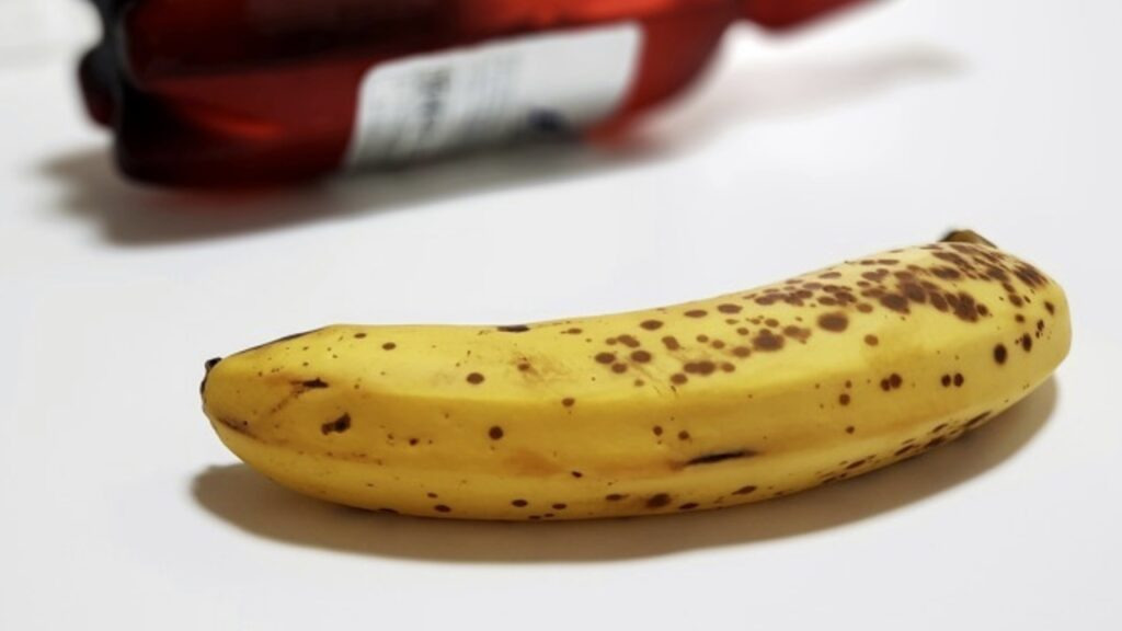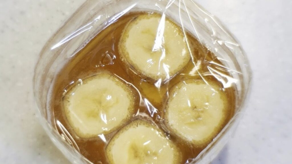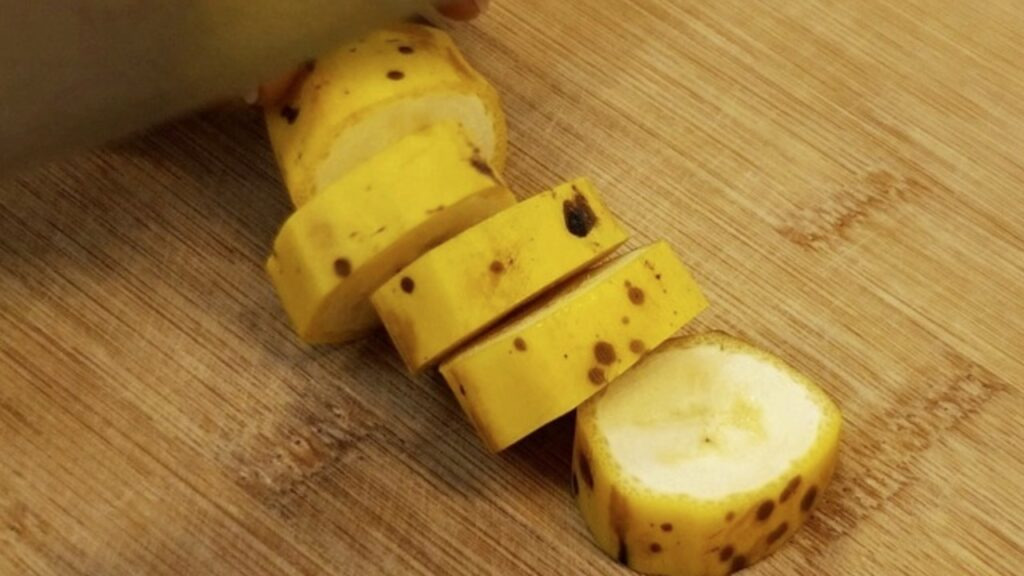 이제 검게 변한 바나나를 준비하세요. 바나나를 2cm 정도 간격으로 잘라 줍니다. 잘 익은 바나나는 초파리 유인에 아주 강력한 효과를 발휘하는데요. 초파리 주 에너지원인 설탕(당)이 듬뿍 들어가 있고, 잘 익으며 풍기는 냄새가 초파리르 강력하게 유인합니다.