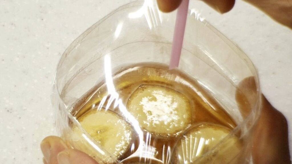 이후 랩으로 페트병 입구를 감싸주세요. 초파리가 들어와 나갈 수 없도록 빈틈 없이 꼭 잘 감싸 줍니다. 그리고 빨대나 젓가락 등으로 구멍을 내어 주세요. 5~8개 정도 내어 주면 초파리가 들어오고 쉽게 나갈 수 없게 됩니다.