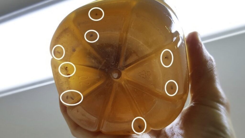 하루 이틀 정도 지나자 많은 초파리가 잡힌 것을 볼 수 있어요. 오래된 바나나의 강력한 향과 알콜인 맥주가 초파리를 유인해 쉽고 간단하게 초파리를 제거할 수 있었습니다.