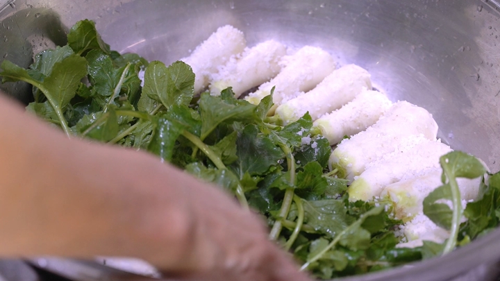 무 절이는 방법은 먼저 양푼에 총각무를 한켜씩 깔아 주세요. 그리고 천일염을 무 부분에 집중적으로 뿌리고, 남은 것은 무청 부분에 뿌려주시면 돼요. 무 부분은 더 많이 절여져야 하기 때문에 무 부분에 천일염을 더 많이 뿌리세요.
