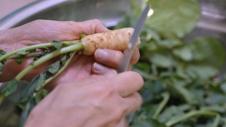 총각무를 다듬는 방법은 무청과 무 사이 부분을 칼로 긁어내 지저분한 부분을 제거하세요. 무청 끝 부분을 조금 자르고, 시든 잎은 떼어 제거하세요.